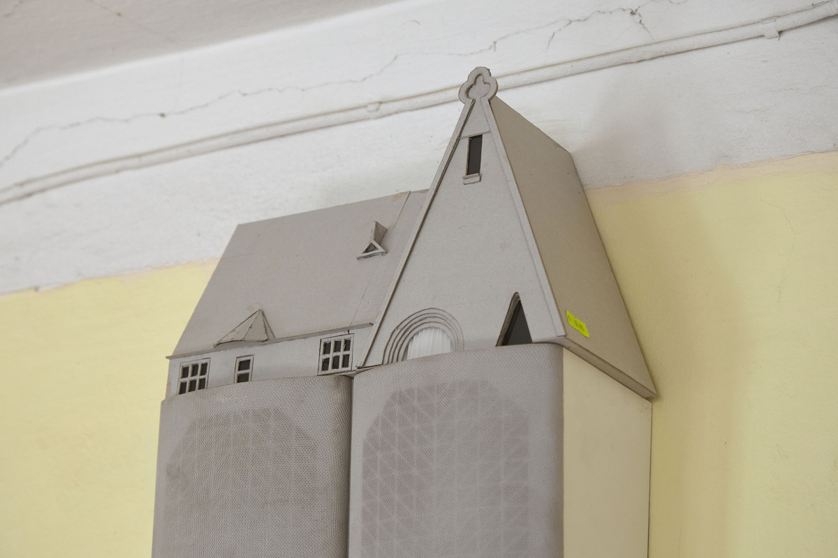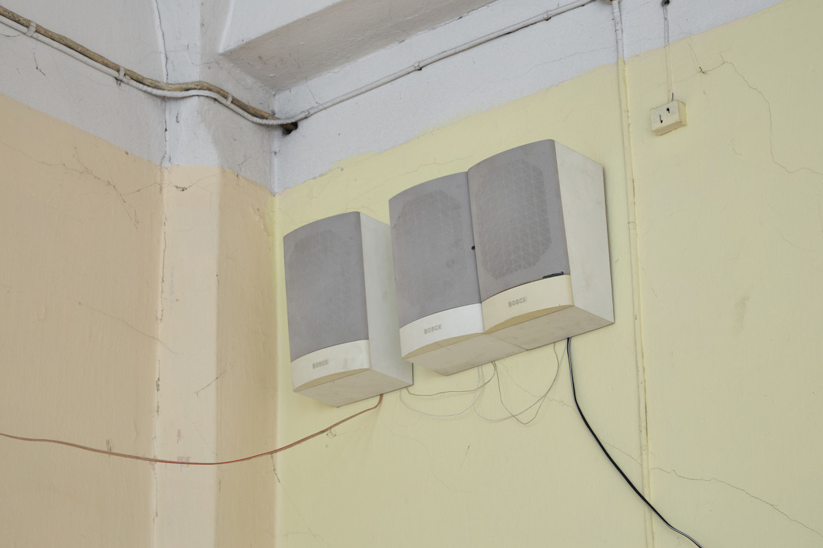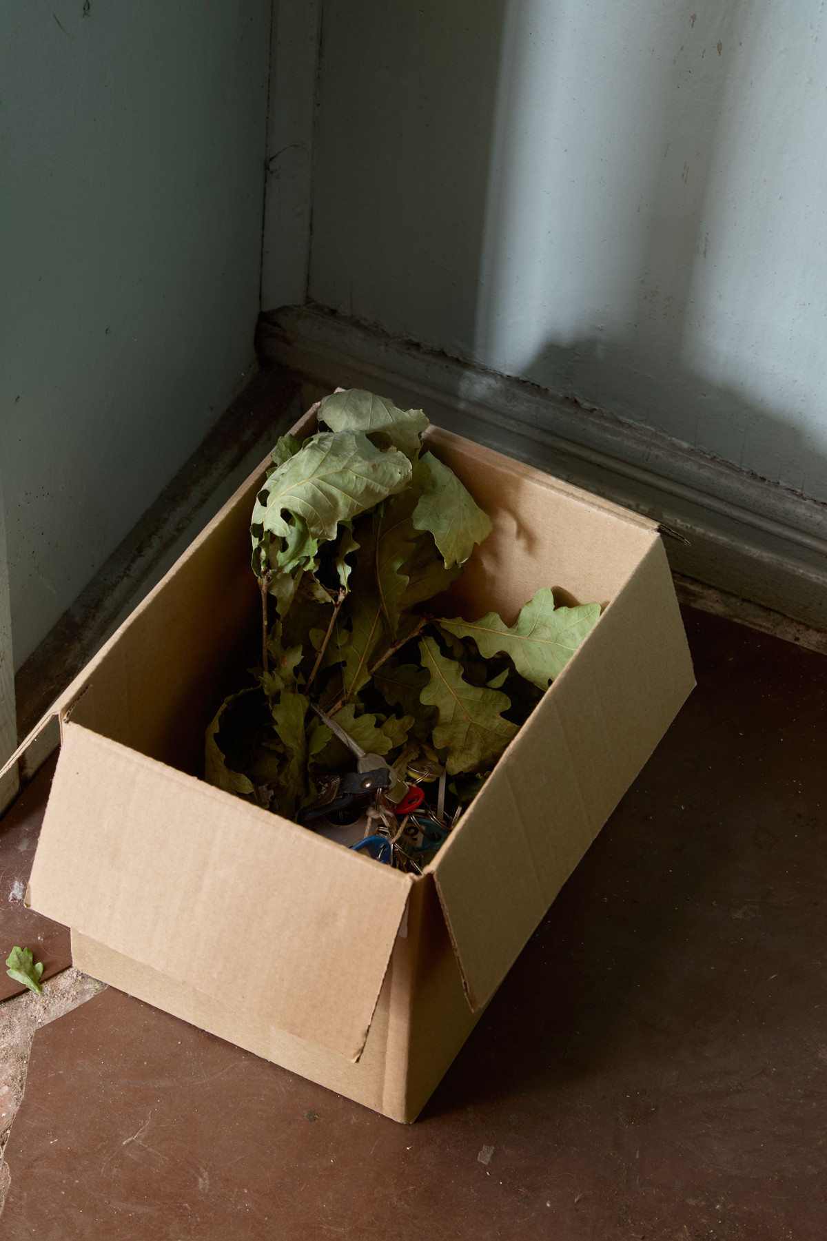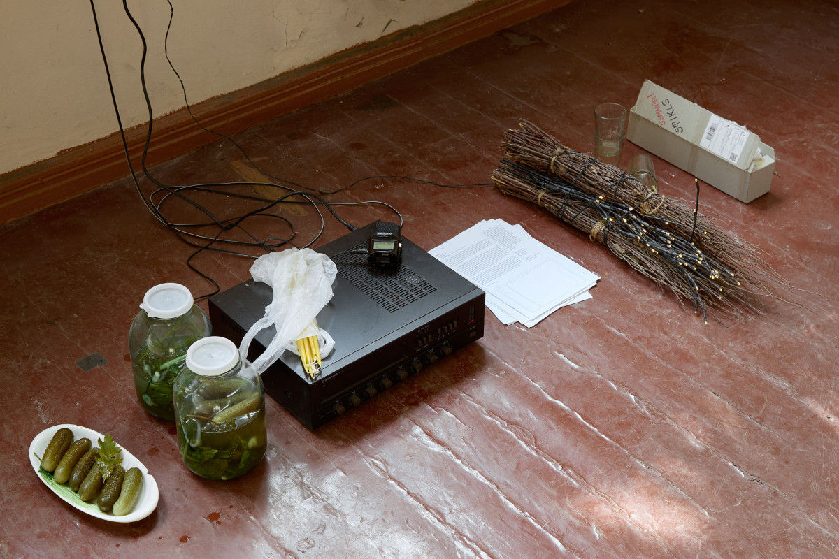 fig.20 Daisy Chain (Detail), 2025 33 speakers; various wiring; loopedaudio file (5:42); fragmented architectural models (Brīvības iela37, Brīvības iela 47, Ģertrūdes iela23, Krišjāņa Valdemāra iela 67); rented amplifier; beeswax candles infused with propolis; granyōnki sourced from Latgale flea market; homemade lightly salted cucumbers; borrowed glassware; borrowed media player; bundles of twigs collected at Hanzas iela 22; LED twig bundle from the artist's apartment; packaging; cardboard box containing oak leaves and found keys. room-sized