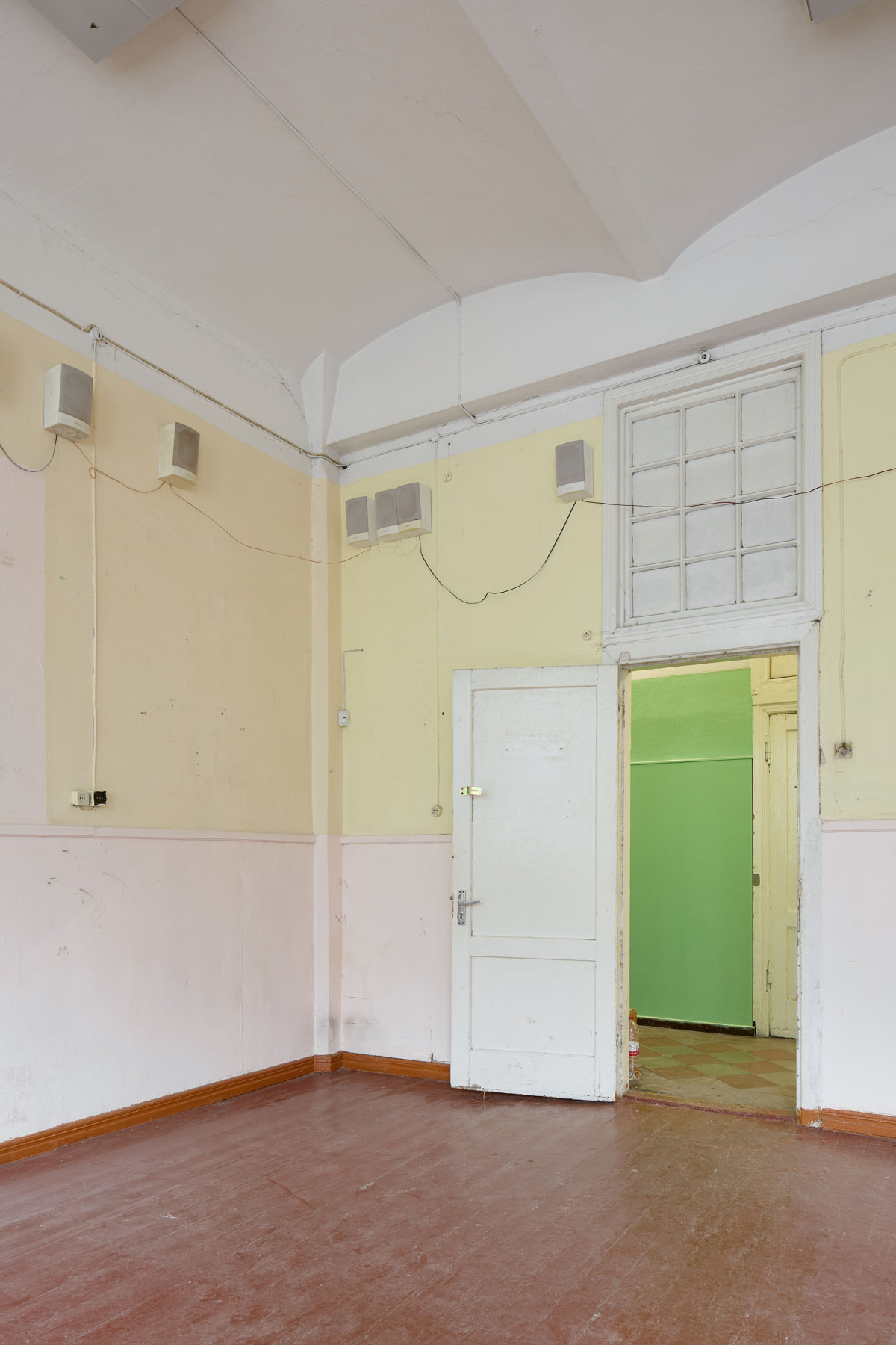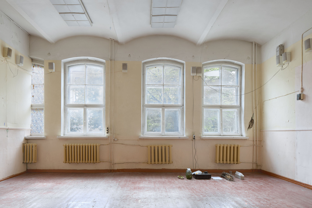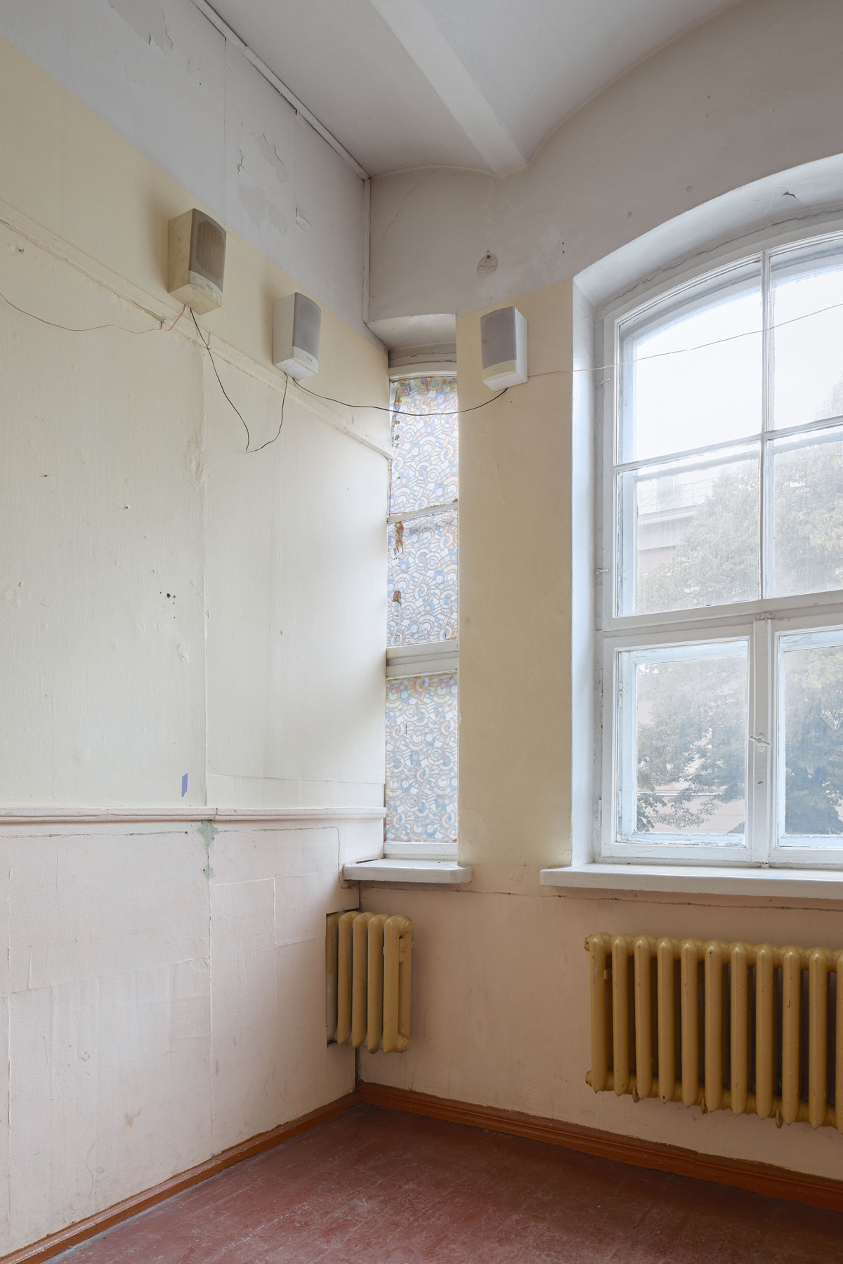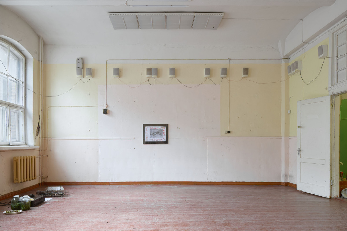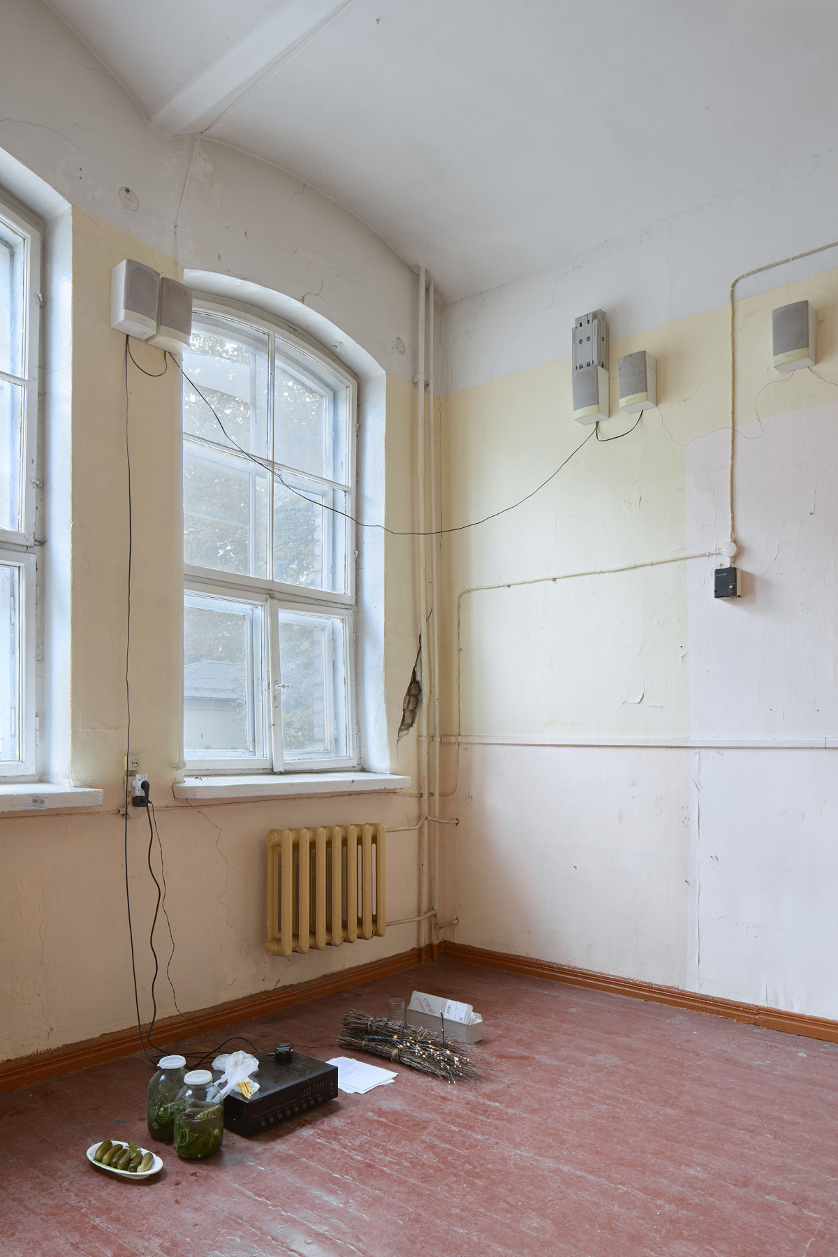 fig.1 Daisy Chain, 2025 33 speakers; various wiring; loopedaudio file (5:42); fragmented architectural models (Brīvības iela37, Brīvības iela 47, Ģertrūdes iela23, Krišjāņa Valdemāra iela 67); rented amplifier; beeswax candles infused with propolis; granyōnki sourced from Latgale flea market; homemade lightly salted cucumbers; borrowed glassware; borrowed media player; bundles of twigs collected at Hanzas iela 22; LED twig bundle from the artist's apartment; packaging; cardboard box containing oak leaves and found keys. room-sized