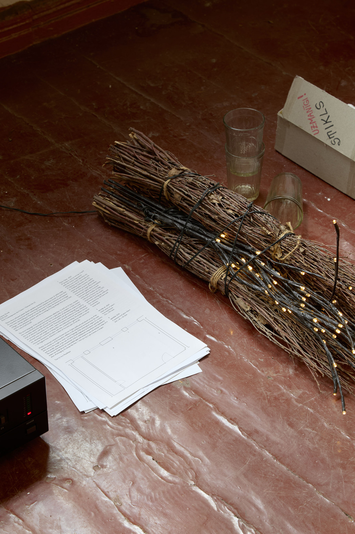 fig.18 Daisy Chain (Detail), 2025 33 speakers; various wiring; loopedaudio file (5:42); fragmented architectural models (Brīvības iela37, Brīvības iela 47, Ģertrūdes iela23, Krišjāņa Valdemāra iela 67); rented amplifier; beeswax candles infused with propolis; granyōnki sourced from Latgale flea market; homemade lightly salted cucumbers; borrowed glassware; borrowed media player; bundles of twigs collected at Hanzas iela 22; LED twig bundle from the artist's apartment; packaging; cardboard box containing oak leaves and found keys. room-sized