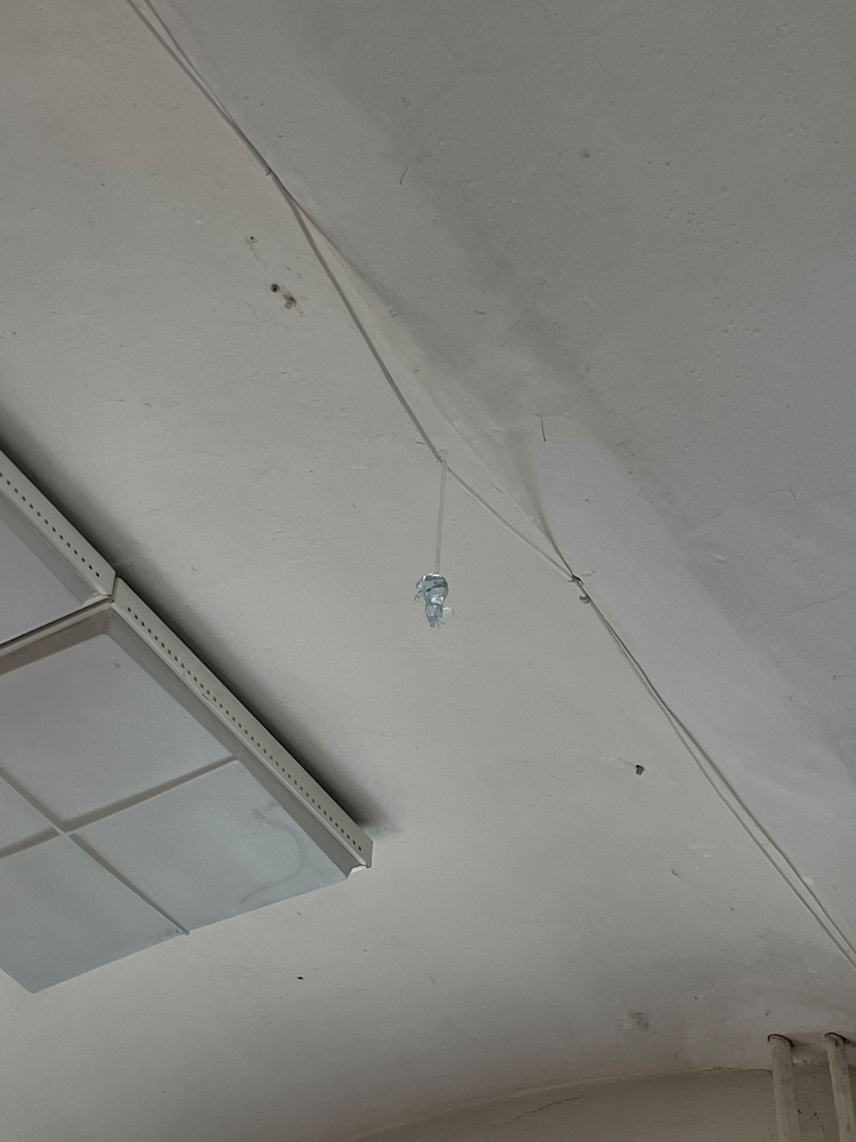 fig.9 Daisy Chain (Detail), 2025 33 speakers; various wiring; loopedaudio file (5:42); fragmented architectural models (Brīvības iela37, Brīvības iela 47, Ģertrūdes iela23, Krišjāņa Valdemāra iela 67); rented amplifier; beeswax candles infused with propolis; granyōnki sourced from Latgale flea market; homemade lightly salted cucumbers; borrowed glassware; borrowed media player; bundles of twigs collected at Hanzas iela 22; LED twig bundle from the artist's apartment; packaging; cardboard box containing oak leaves and found keys. room-sized