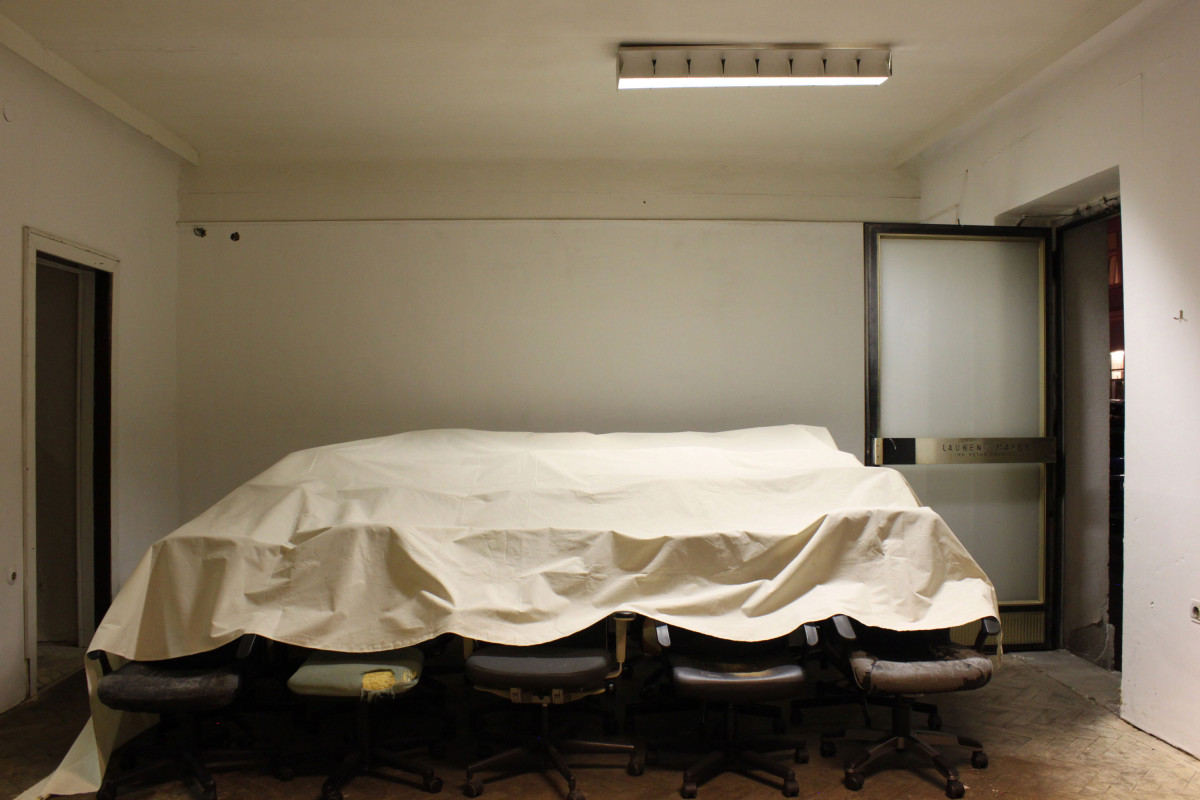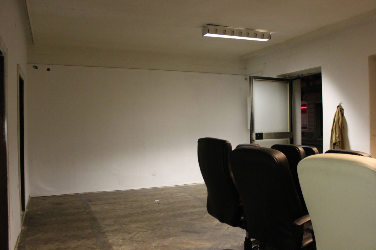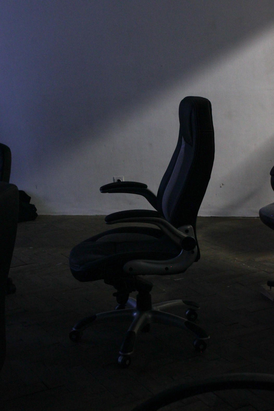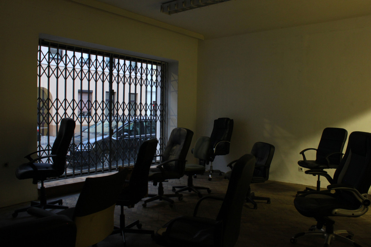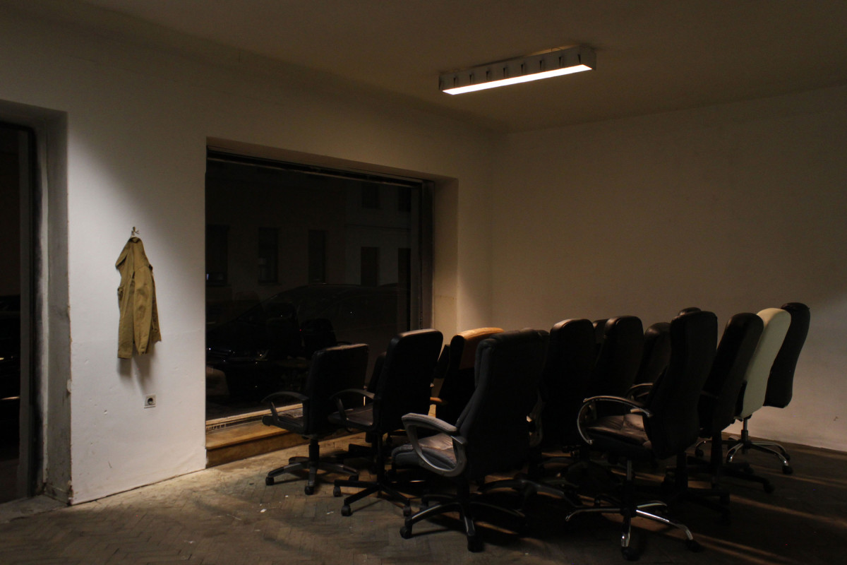 Three Rooms is an intstallative play made up by objects in the space, its architectural interactions (door, fence,..), light and their relation within the space. Featuring 19 used office-chairs, a jacket, a hook, a bag, a doorstop, a bluetoothbox, a piece of cloth and the ominous objekt a. Their positions and relations changed over the course of the opening, presenting three distinct situations or states with the exact same set of things: New in Town (Room 1), No Peer Pressure Without Peers (Room 2) and The Power of Denial (Room 3).