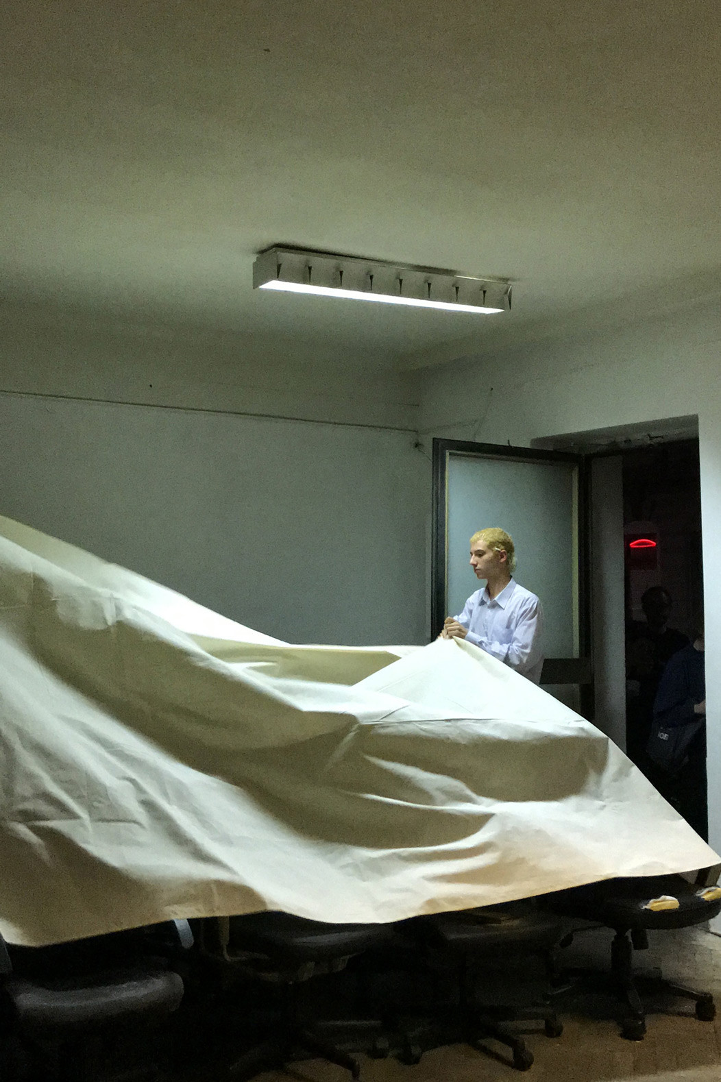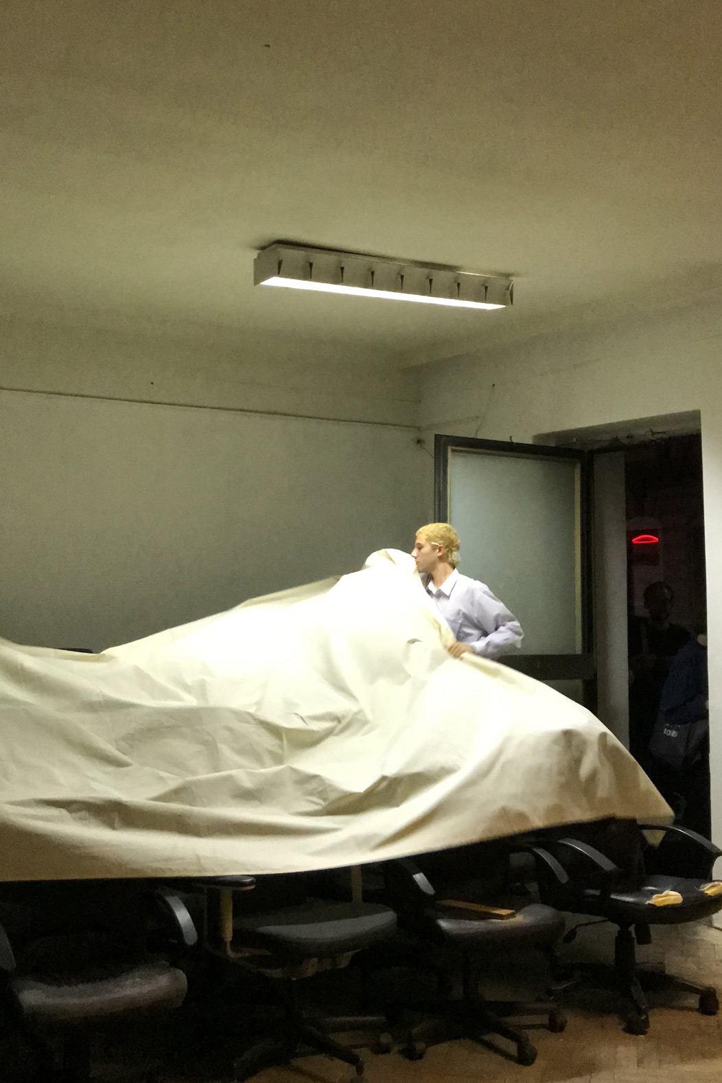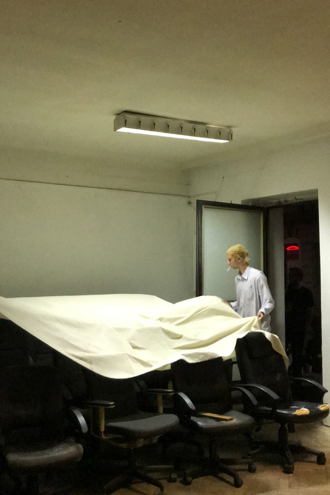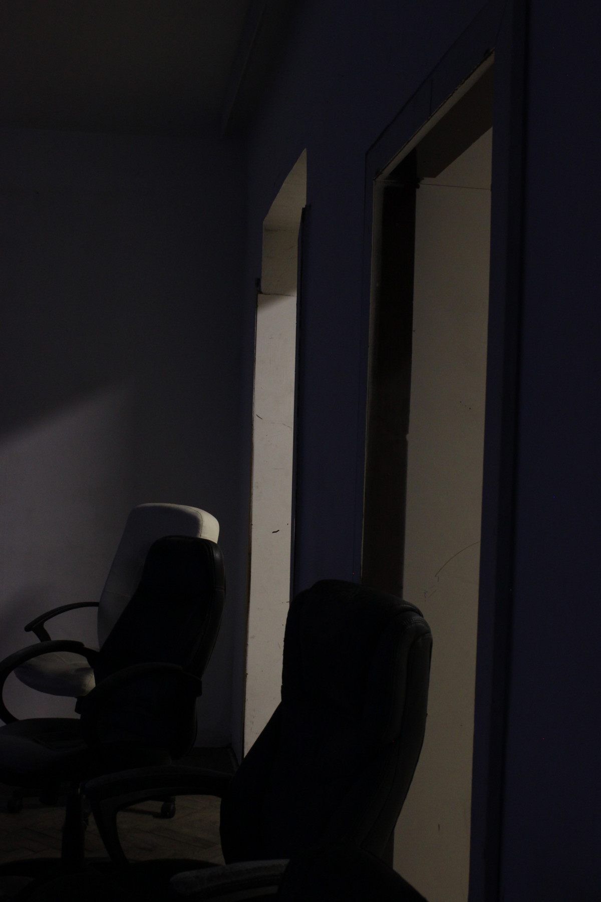 Three Rooms is an intstallative play made up by objects in the space, its architectural interactions (door, fence,..), light and their relation within the space. Featuring 19 used office-chairs, a jacket, a hook, a bag, a doorstop, a bluetoothbox, a piece of cloth and the ominous objekt a. Their positions and relations changed over the course of the opening, presenting three distinct situations or states with the exact same set of things: New in Town (Room 1), No Peer Pressure Without Peers (Room 2) and The Power of Denial (Room 3).