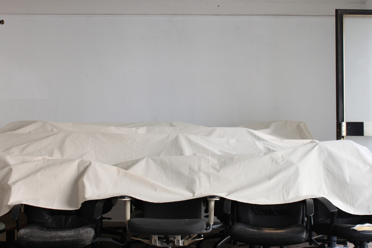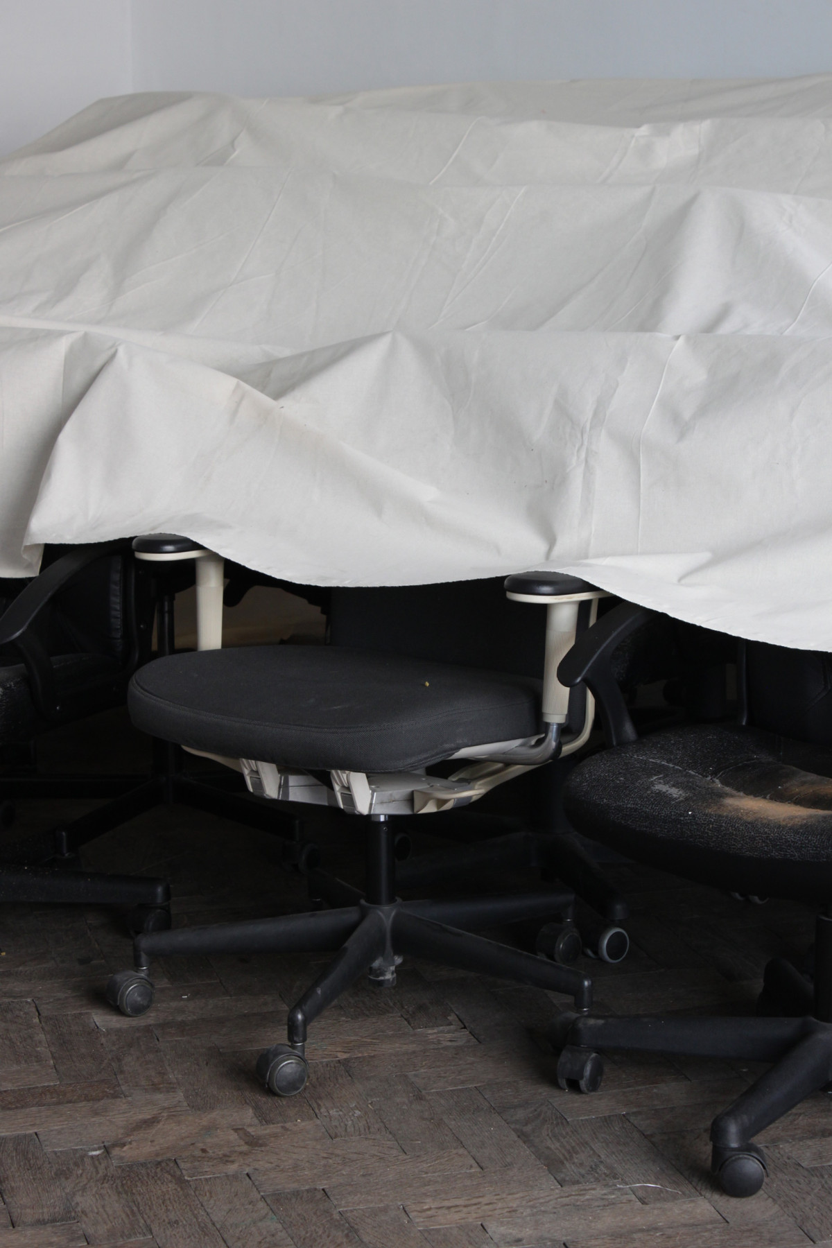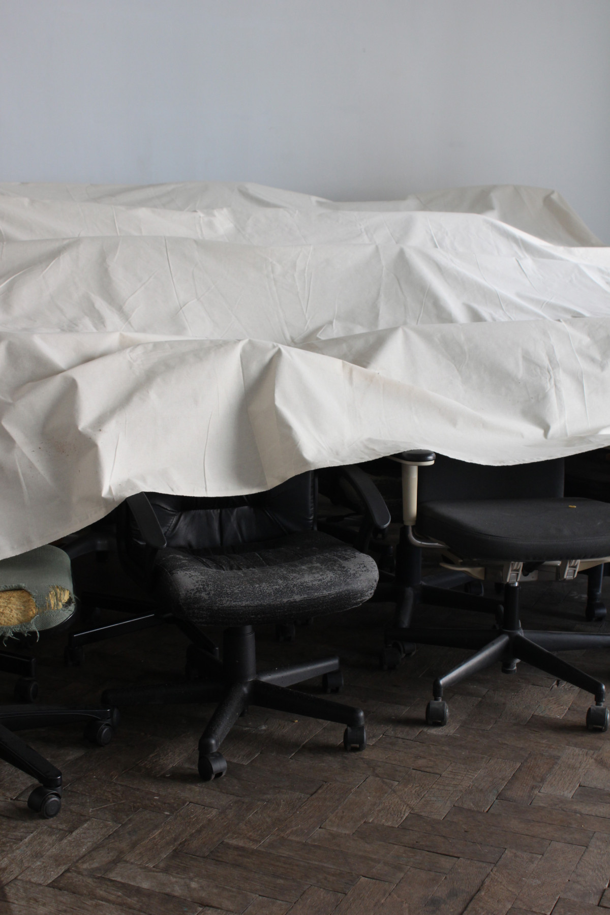 fig.20 The Power of Denial (Room 3), 2020 19 used office-chairs, a jacket, a hook, a bag, a bluetooth speaker, a doorstop, a piece of cloth, objekt a various dimensions