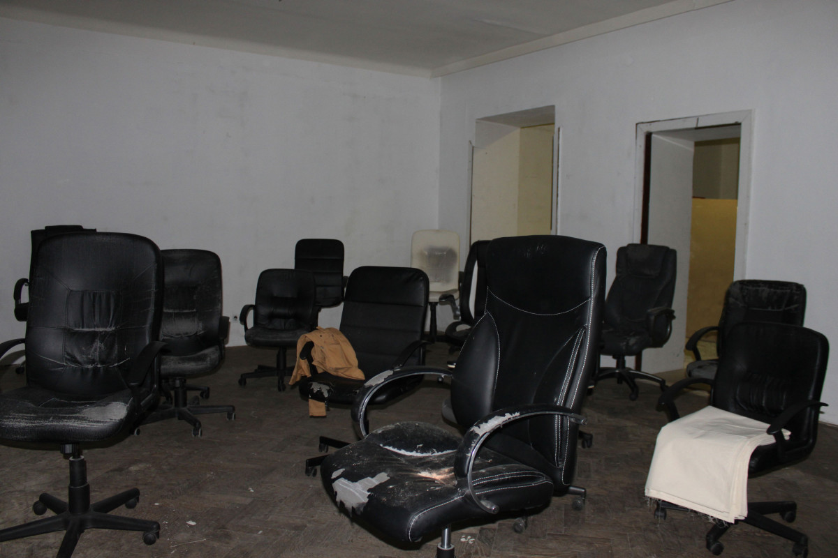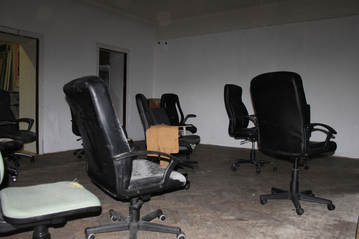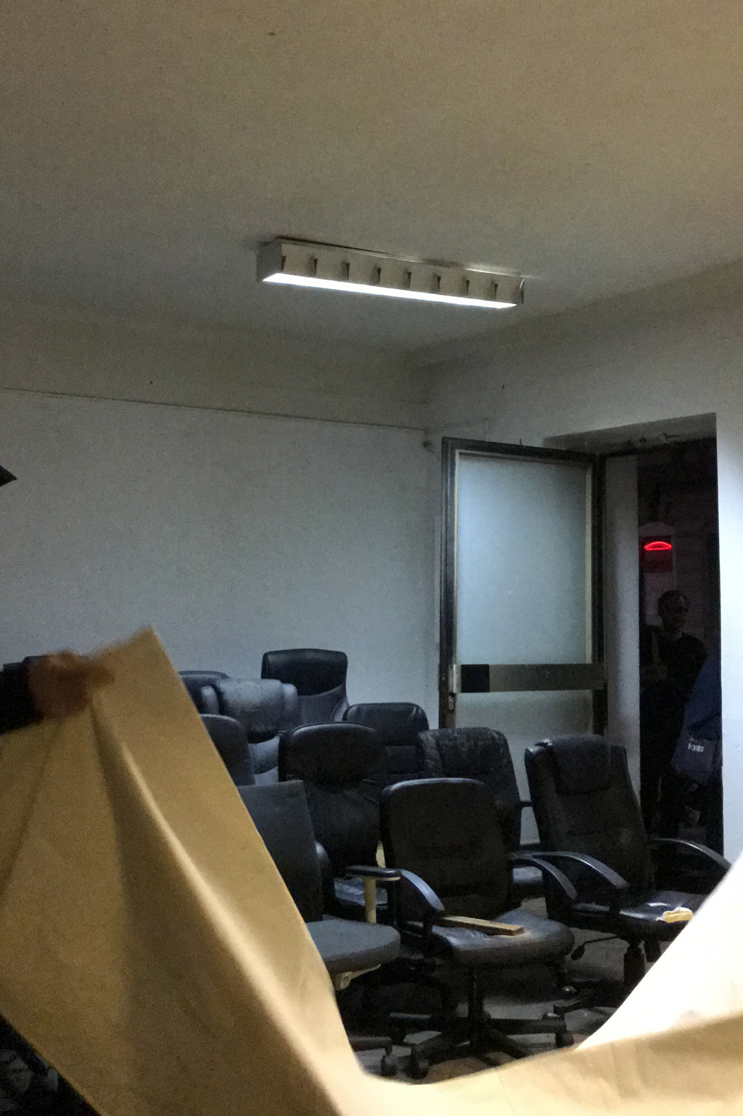 fig.20 The Power of Denial (Room 3), 2020 19 used office-chairs, a jacket, a hook, a bag, a bluetooth speaker, a doorstop, a piece of cloth, objekt a various dimensions