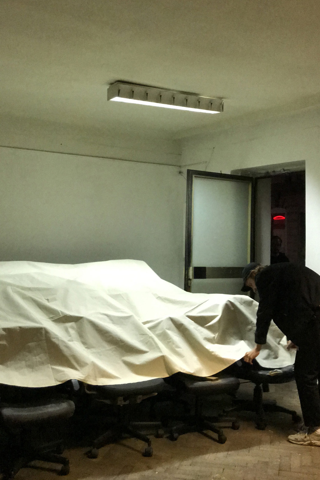 fig.4 New In Town (Room 1), 2020 19 used office-chairs, a jacket, a hook, a bag, a bluetooth speaker, a doorstop, a piece of cloth, objekt a various dimensions
